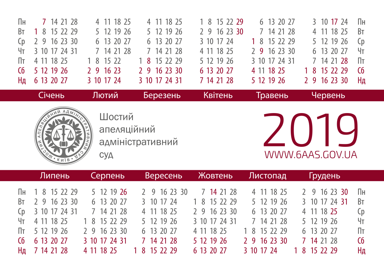 Сірим кольором відмічені робочі суботи, а бордовим – вихідні дні суду. Календр буде зручним та корисним для постійних відвідувачів Шостого ААС.
