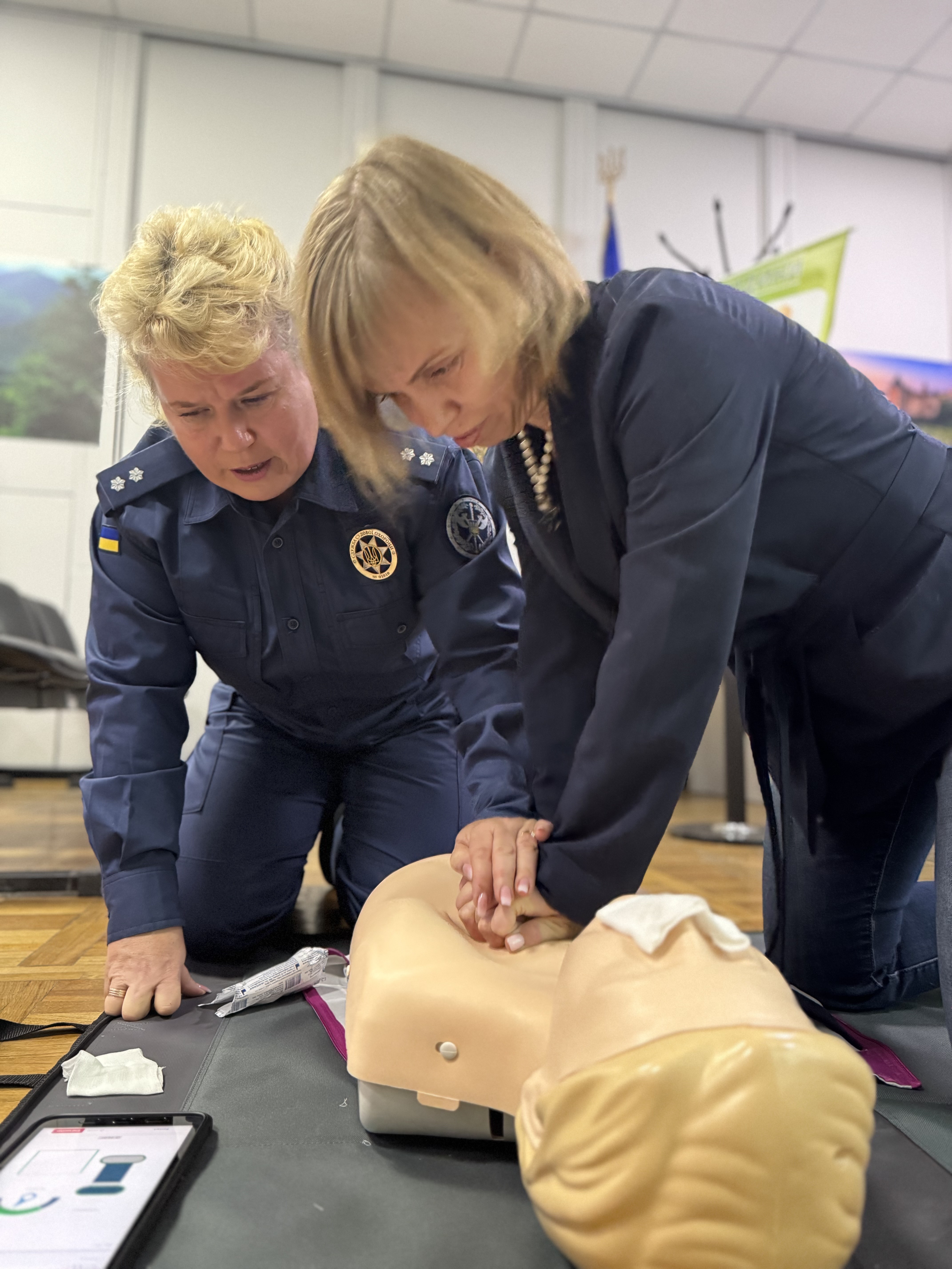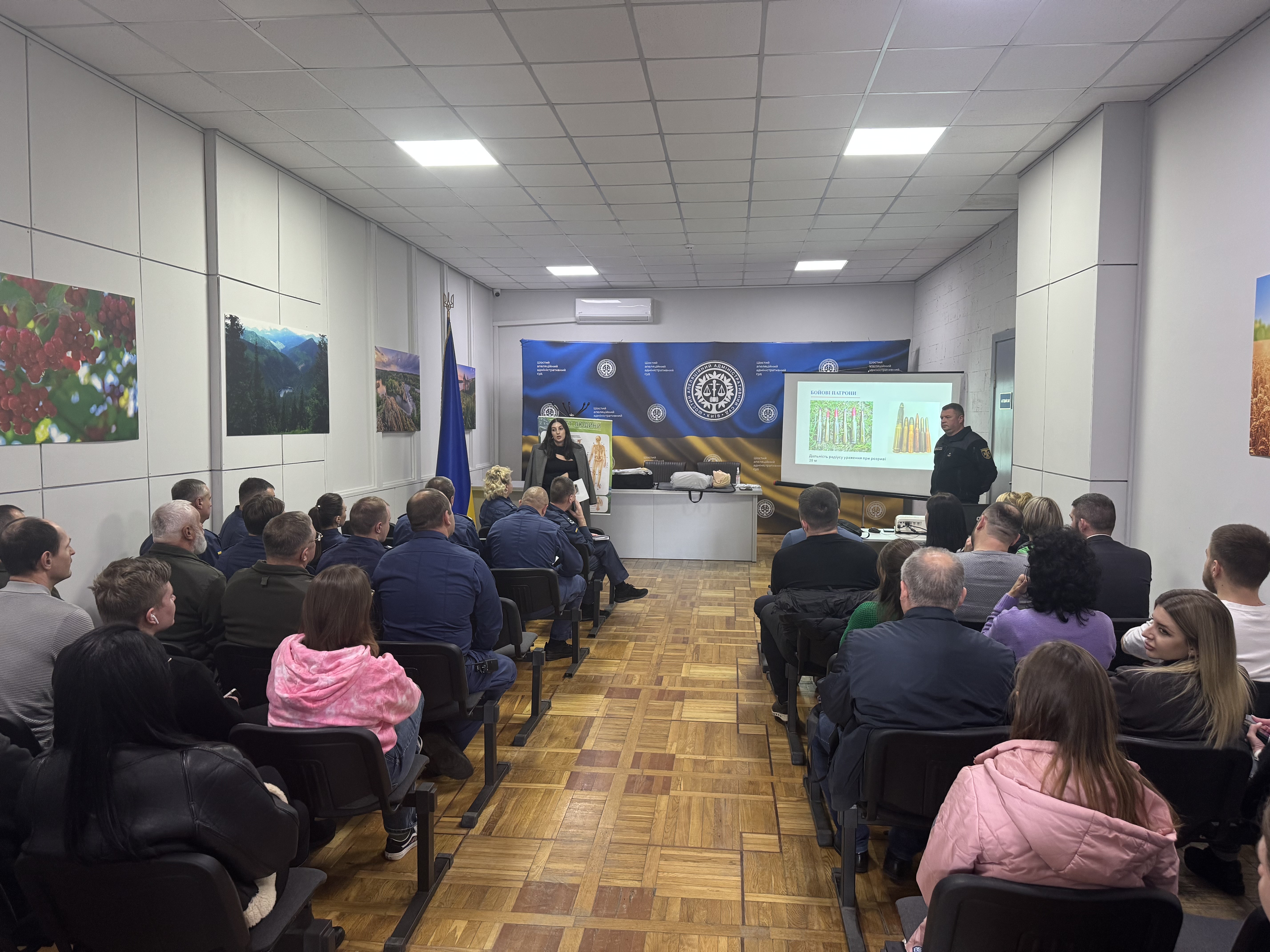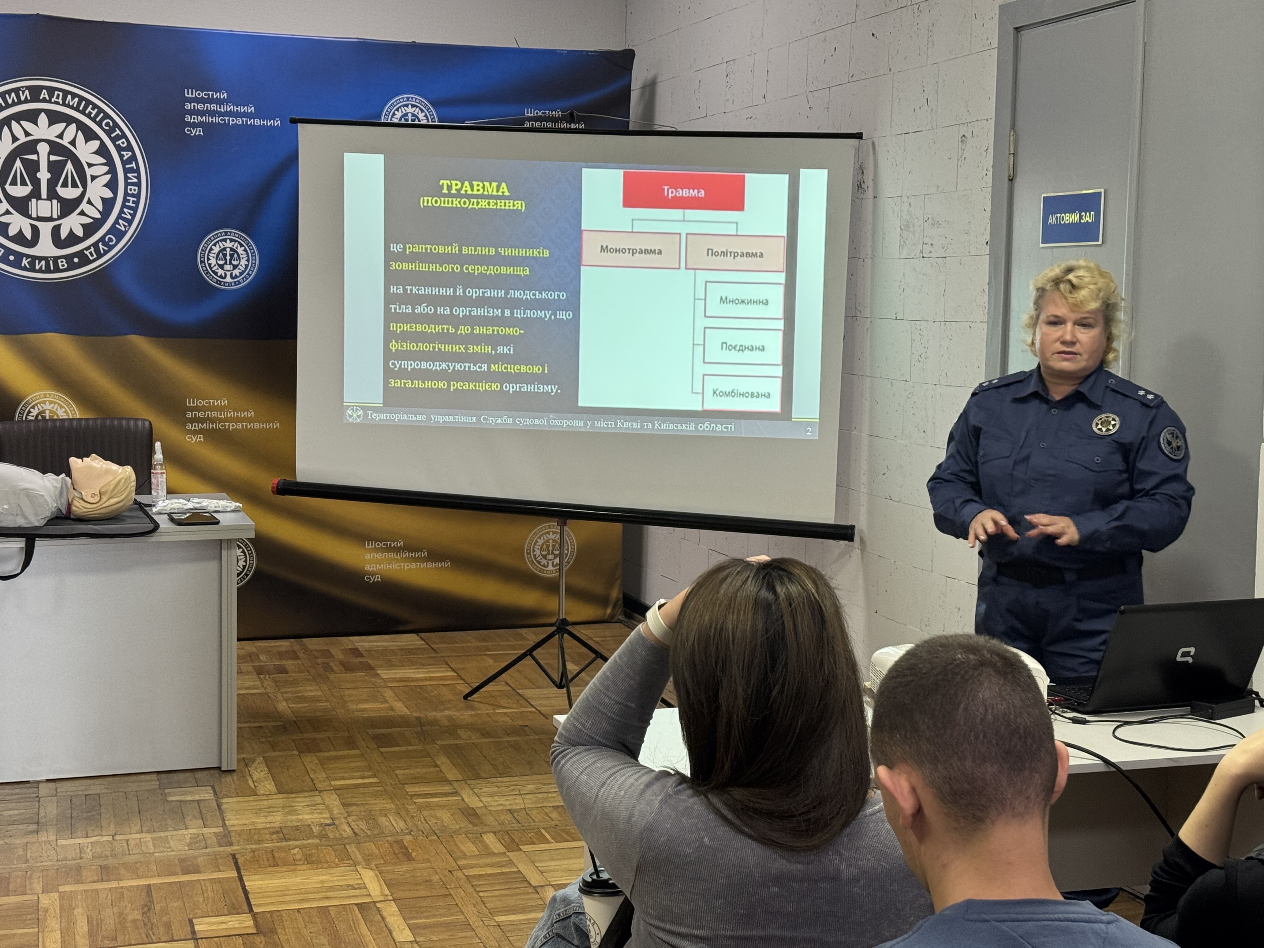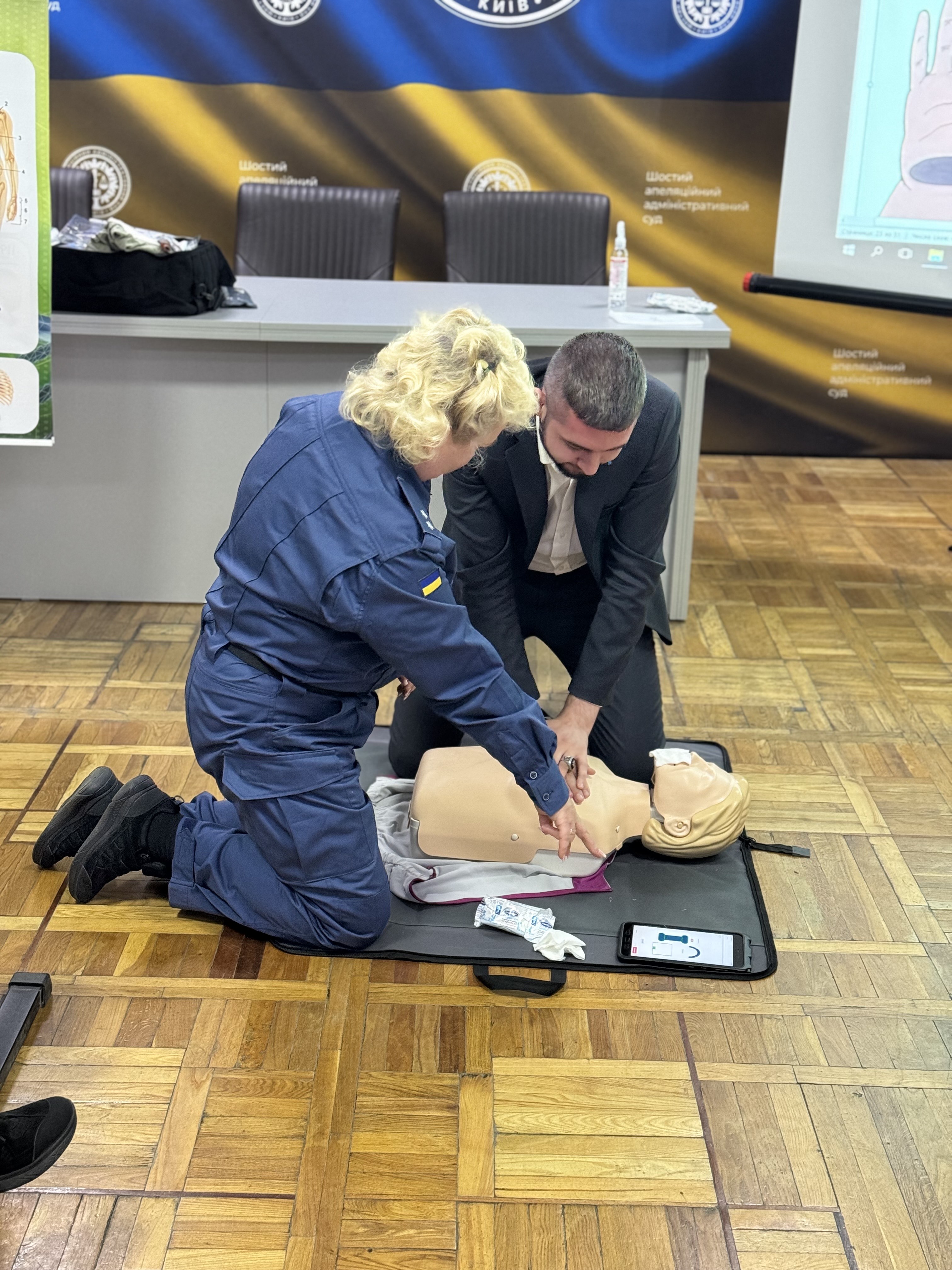 Начальник медичної допомоги ТУ ССО в м. Києві та Київській області Лариса Скорич детально розповіла та пояснила на практиці послідовність дій при наданні домедичної допомоги при всіляких видах ушкоджень різних частин тіла людини. Також під час тренінгу працівники Шостого ААС мали змогу навчитись особисто надавати першу домедичну допомогу при раптовій зупинці серця.